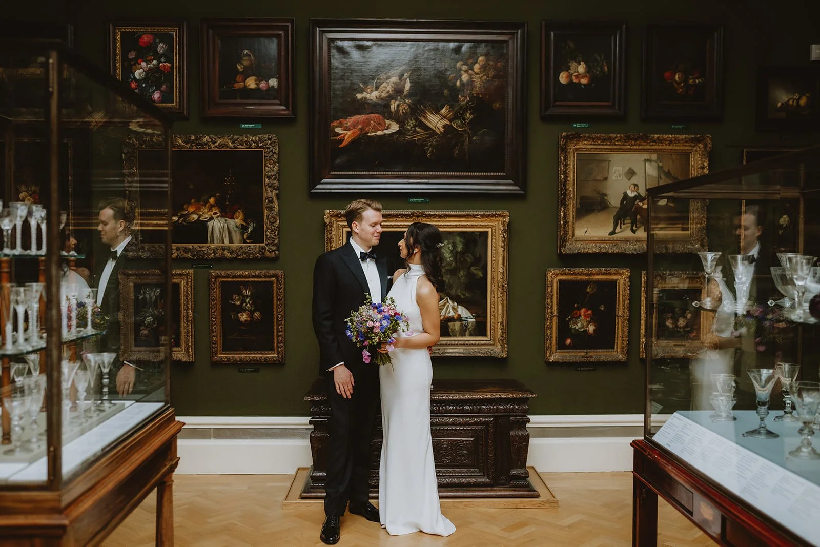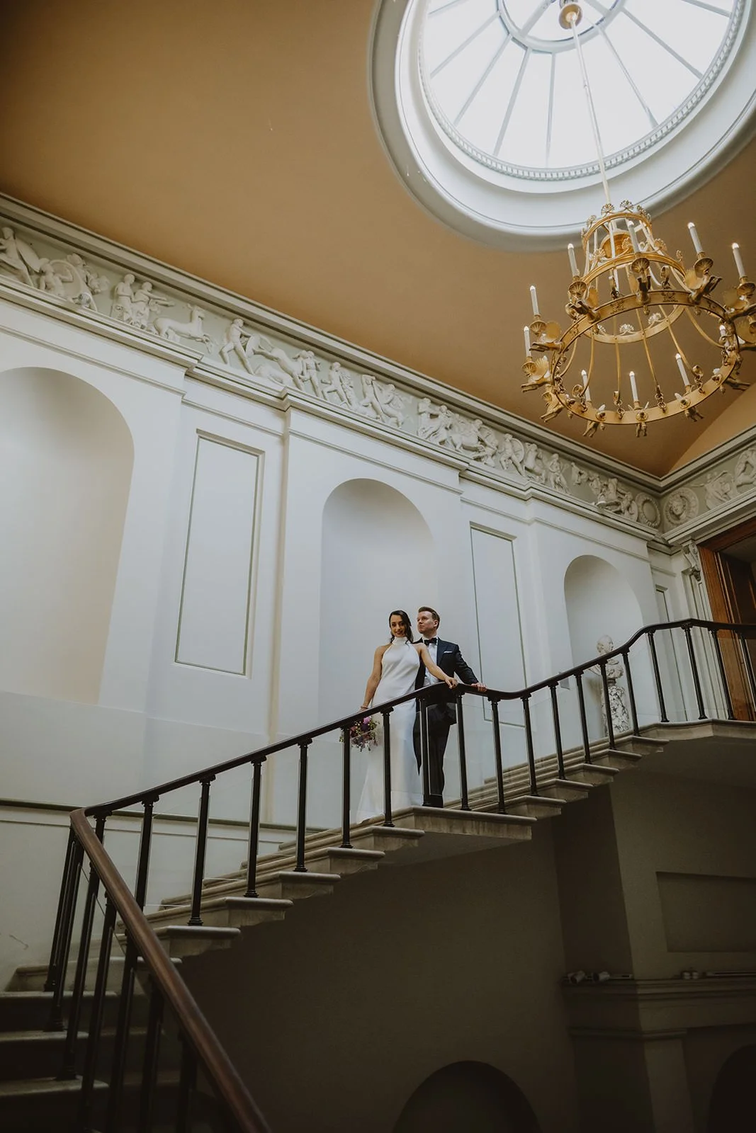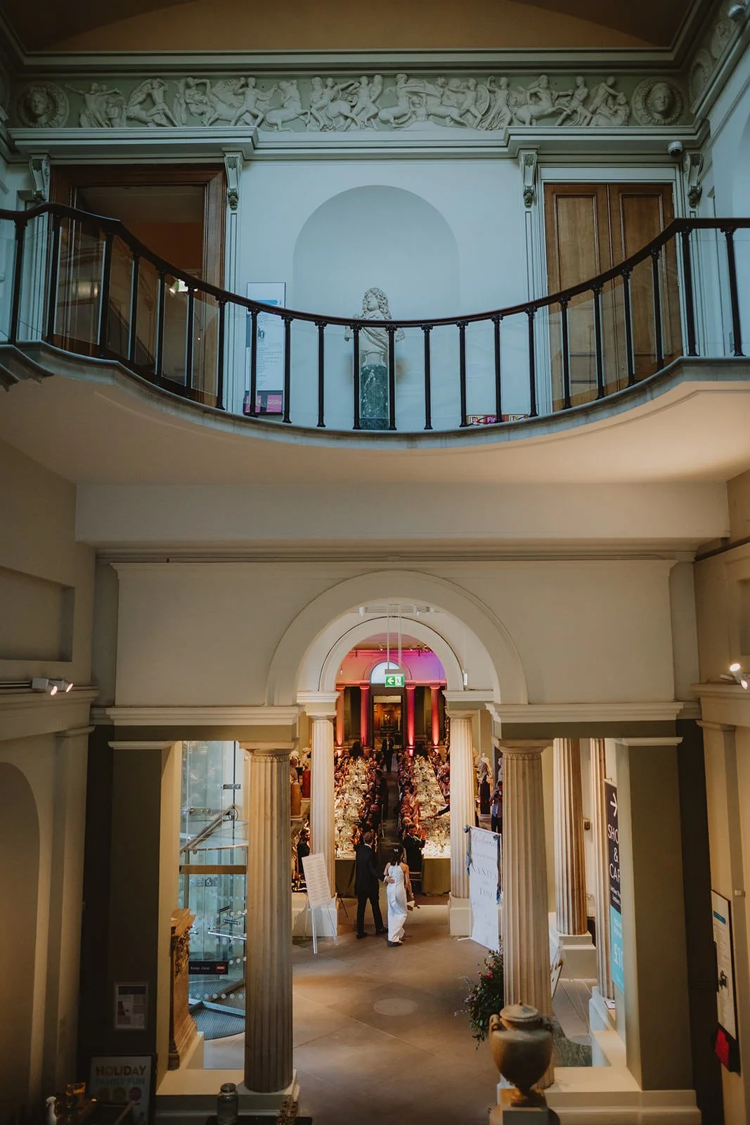 As evening fell, guests arrived at the magnificent Ashmolean Museum for the reception. Cocktails flowed with a live jazz band as the newly weds made their way down the incredible staircase to join their guests. An Indian thali plate feast was served on long tables in the Statue Gallery before descending to the museum's cellar, where the DJ kept everyone dancing late into the night.